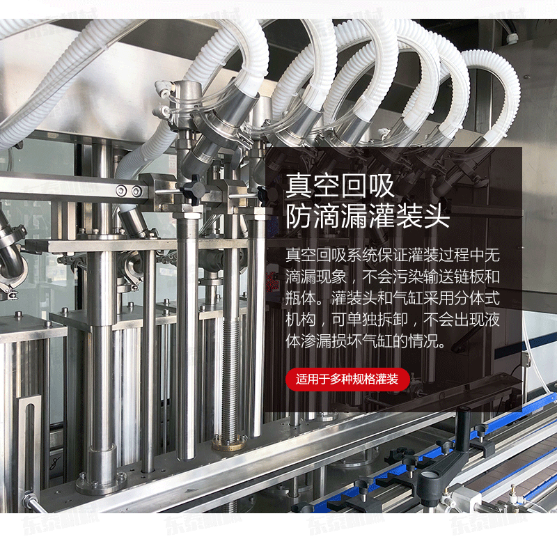 1.真空回吸系統(tǒng)保證灌裝過程中無滴漏現(xiàn)象,不會污染輸送鏈板和瓶體。灌裝頭和氣缸采用分體式機構,可單獨拆卸,不會出現(xiàn)液體滲漏損壞氣缸的情況。進口亞德客氣缸經久耐用,其他密封等配件使用標準件,更換維護簡單方便。