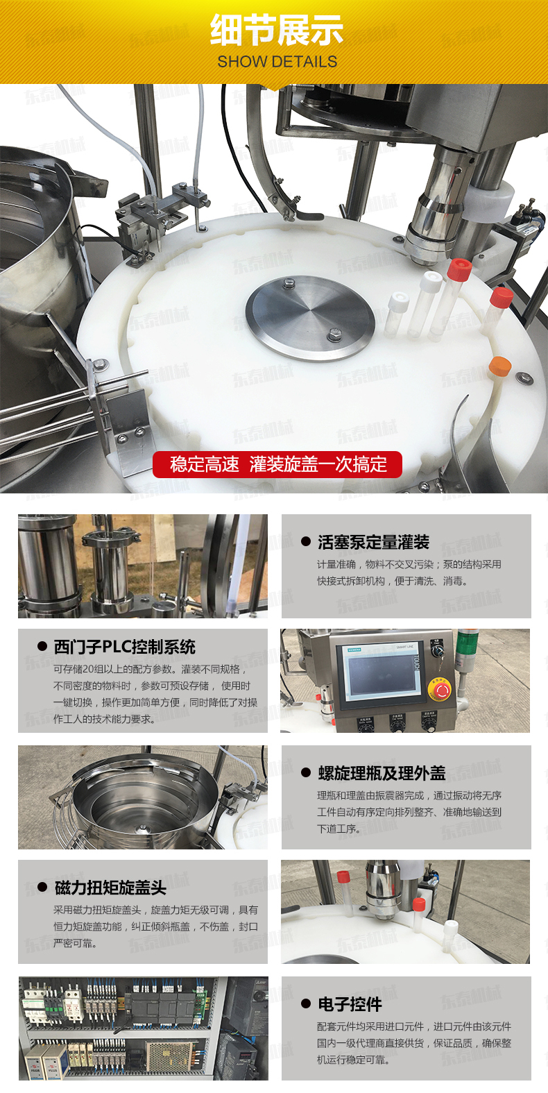 診斷試劑灌裝旋蓋一體機(jī)在性能上、質(zhì)量上液體灌裝機(jī)具有高速、可靠性強(qiáng)、產(chǎn)量高等優(yōu)點(diǎn),為整個(gè)行業(yè)的發(fā)展來(lái)說(shuō)帶來(lái)了巨大的發(fā)展商機(jī),也為液體類(lèi)商品帶來(lái)更廣闊的發(fā)展前景。液體灌裝機(jī)的操作簡(jiǎn)便,運(yùn)行穩(wěn)定,能有效節(jié)省企業(yè)成本,即可單機(jī)使用,也可進(jìn)行搭配理瓶機(jī)、液體灌裝機(jī)、旋蓋機(jī)、封口機(jī)、貼標(biāo)機(jī)等等設(shè)備組成一條生產(chǎn)流水線作業(yè),各單機(jī)能獨(dú)立完成其工作,有獨(dú)立的操作系統(tǒng),各單機(jī)聯(lián)動(dòng)、分離快捷,并且調(diào)整快速、簡(jiǎn)單,使生產(chǎn)的每個(gè)工序保證協(xié)調(diào)。廣泛應(yīng)用于食品、化妝品、醫(yī)藥、油脂、日化、洗滌劑、農(nóng)藥、化工等行業(yè)的灌裝。